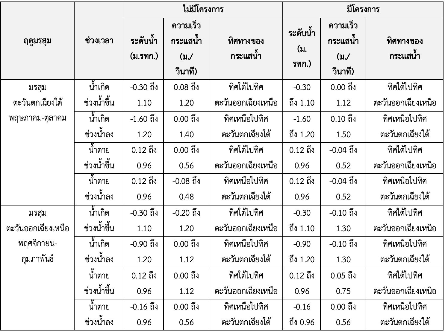 - ฤดูมรสุมตะวันตกเฉียงใต้: 0.08 - 1.20 เมตร/วินาที